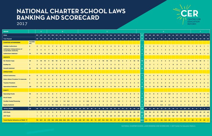 March 22, 2017: Since 1996, CER’s yearly scorecard and ranking of state charter school laws has provided guidance and feedback to policymakers on the relative strengths and weakness of charter school policies and their effectiveness in fulfilling the true meaning of the words “charter school law,”— i.e., paving the way for high numbers of strong, autonomous, healthy charter schools, that provide meaningful opportunities for families and their children, and the chance for innovation for all involved.
